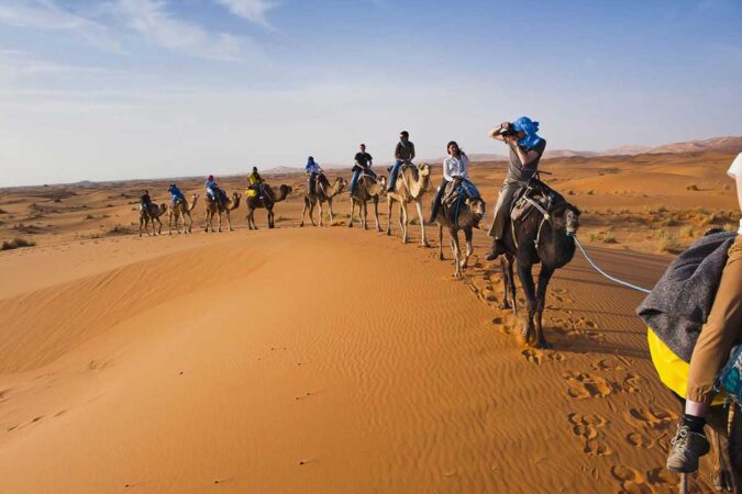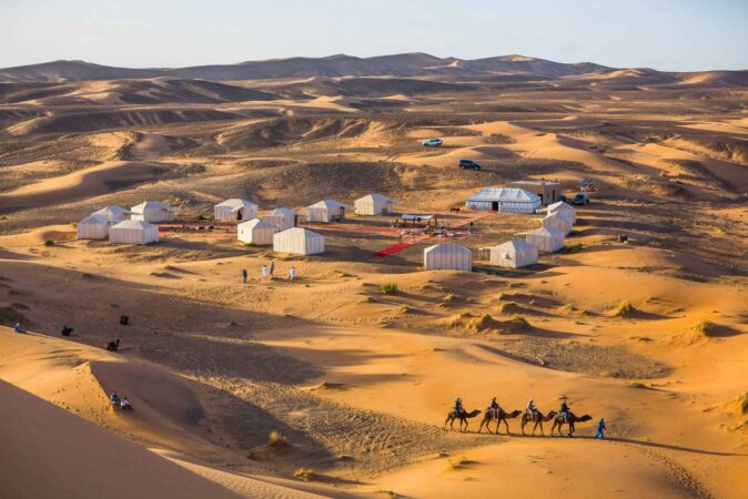 Continue through the palm groves of Skoura, the dramatic Dades Valley, and the towering cliffs of Todgha Gorge before reaching the golden dunes of Merzouga. Experience a camel trek at sunset and a night under the stars in a traditional Berber desert camp.