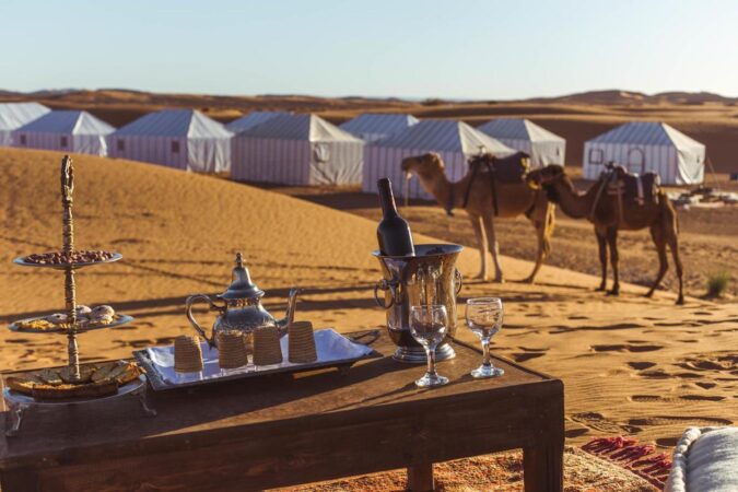 Here, your camel caravan awaits to take you on a two-hour trek across the golden dunes at sunset. Arrive at your Berber desert camp, enjoy traditional music, a Moroccan dinner, and a night under the breathtaking Saharan sky.